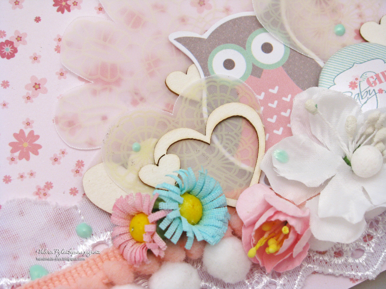 Из ОЭ я использовала кальку и ленту. На ленту завязывается сам миник, а калька с принтом из набора для вырезания ТМ "Евгении Курдибановской" (подарок Лены Базюк). Тон работе задала бумага из коллекции "Baby Girl" ТМ "СкрапМир". Также использовала бирюзовые дотсы "OneGOG ТМ".