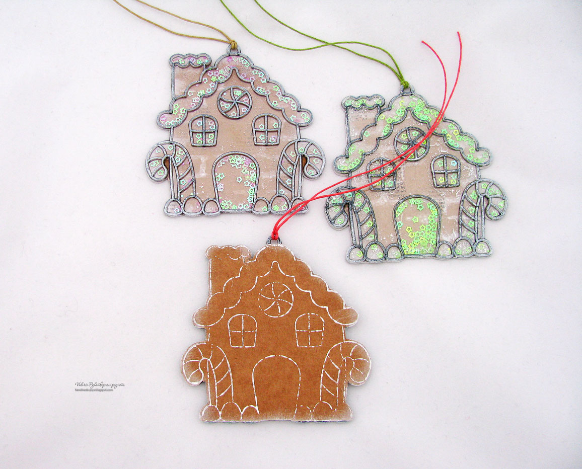 Переделала их из наборчика для раскрашивания витражными красками. Крафт-картон покрыла акриловой краской через трафарет "кирпичная кладка" ТМ "ЕК" (ну, это же все-таки домик :)) Немножко поштамповала фоновым штампом ТМ "Lesia Zgharda", насыпала пайеток-звезд, края подтонировала белой акриловой краской - и елочная игрушка готова! Даже слегка шуршит :)