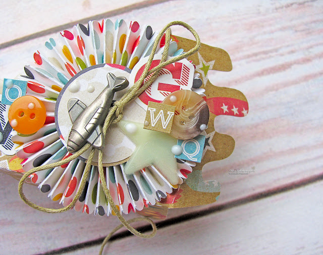 Поначалу вообще не могла придумать, как же оформить такие коробочки для мальчиков, но потом пришло вдохновение и сразу все стало на свои места: розеточки, самолетики, звездочки, пуговки и наклейки-буквы. Плюс вощеный шнур и дотсы - все! Мне нравится :)
